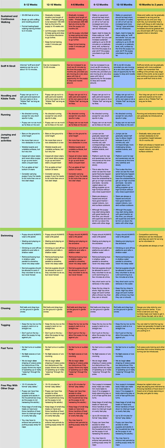 Exercise not only builds the puppies' bodies, it helps build their minds. But exercise that’s not appropriate for a puppy’s age and development can cause significant and irreversible damage. What would be a simple sprain in an adult dog could leave a puppy with a misshapen or shortened limb, so this is a subject that should be taken seriously.UNDERSTANDING PUPPY BODIES