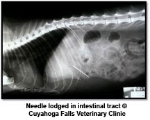 Dogs and cats eat some pretty darned crazy things! Sure, I can understand nabbing a loaf of bread from the kitchen counter or sneaking some “kitty roca” out of the litter box. But why on earth eat a pair of panty hose, a sewing needle, Lego pieces, or mama’s favorite diamond earrings? Just when I think I’ve seen it all, something new surprises me. Dogs, more so than cats, tend to be “repeat offenders.” I recall one Labrador in particular who had six surgeries over the course of his lifetime to remove socks lodged within his intestinal tract (in spite of counseling his humans repeatedly on picking up their socks). As many surgeries as this dog had, we should have installed an abdominal zipper!