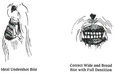 BITE – Undershot. Jaw is broad and wide. A missing tooth or slightly misaligned teeth should not be too severely penalized. Teeth and tongue should not show when mouth is closed. [Fault: Overshot bite.] CLARIFICATION: This section of the standard should be read in conjunction with the section on muzzle. In judging whether a bite is too undershot, the muzzle should be viewed from the side as well. A bite that is too undershot, when viewed form the side, cannot be perpendicular, as required in the section on muzzle. If, when viewed from the side, the muzzle is tilted back giving a "scooped faced" appearance, the bite is too undershot, regardless of whether the teeth show. If the bite is level or overshot, the muzzle will fall away or recede.